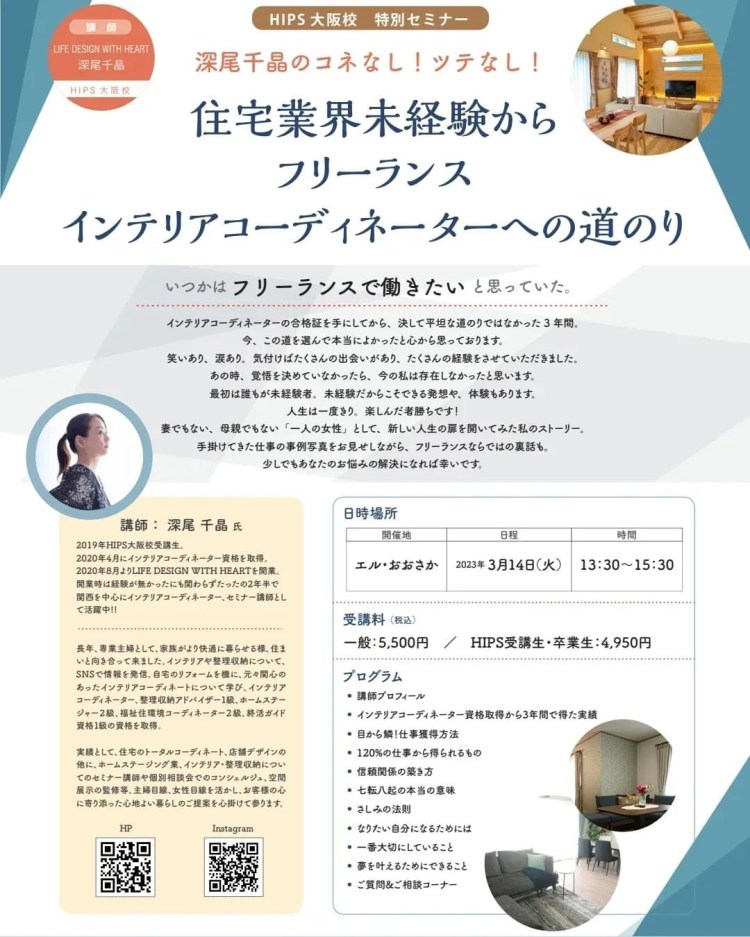 セミナー 3月13日HIPS大阪校主催セミナー 詳しくはこちらとこちらから… 7月HIPS大阪校様主催セミナー 開催の様子は こちら と こちらから… 7月HDC神戸様主催セミナー 開催の様子はこちらから… CLASTORiE LABにて登壇 詳細はこちらより… 3月 行政書士松岡たくみ様主催コラボセミナー 開催の様子はこちらから… 3月 HIPS大阪校 特別セミナー 深尾千晶のコネなし!ツテなし! フリーランス インテリアコーディネーターへの道のり 詳しくはこちらから… 開催の様子はこちらから… 2月 HDC大阪主催 インテリアセミナー 詳しくはこちらから… 開催の様子はこちらから… HDC大阪主催 インテリアセミナー 詳しくはこちらから… 開催の様子はこちらから… 7月HDC神戸様主催インテリアセミナー 詳しくはこちらから… 開催の様子はこちらから… HDC神戸様主催 インテリアセミナー 詳しくはこちら… 開催の様子はこちらから… オンラインセミナー 詳しくはこちら… 共有: クリックして X で共有 (新しいウィンドウで開きます) X Facebook で共有するにはクリックしてください (新しいウィンドウで開きます) Facebook いいね 読み込み中…