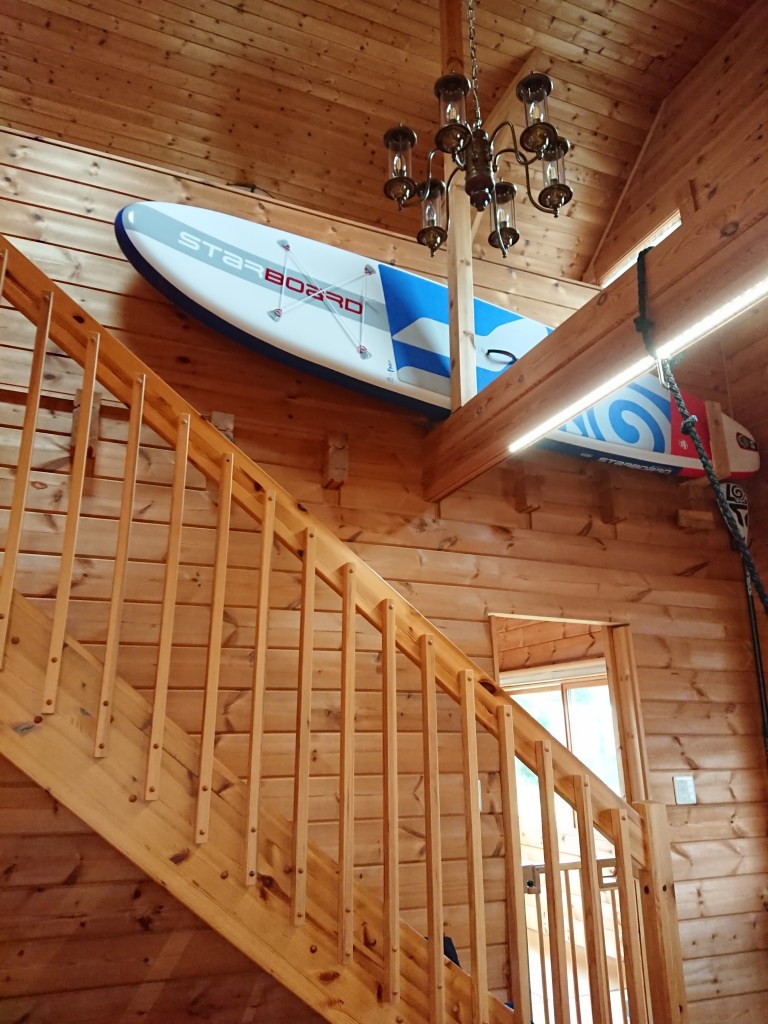 最近、SUPを始めたらしく、保管場所はリビングの吹き抜けのこちら。梁を利用して支えにしているようです。梁には子供が遊びながら体を鍛えるためのロープが吊るしてあったり、LEDテープライトが設置されていたりと、いろいろ細工がしてあります^^