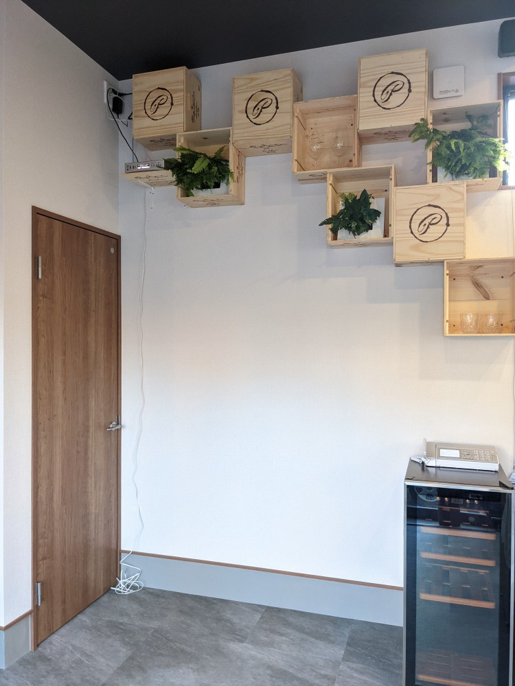 そして、入口入ってすぐの正面の壁には、オーナー様にご用意いただいたワインの木箱をランダムに配置しました。心ばかりのお祝いで贈らせていただいた観葉植物も飾らせて貰いました。入口が自動ドアとオープンなので、良いアイキャッチになったかな♫