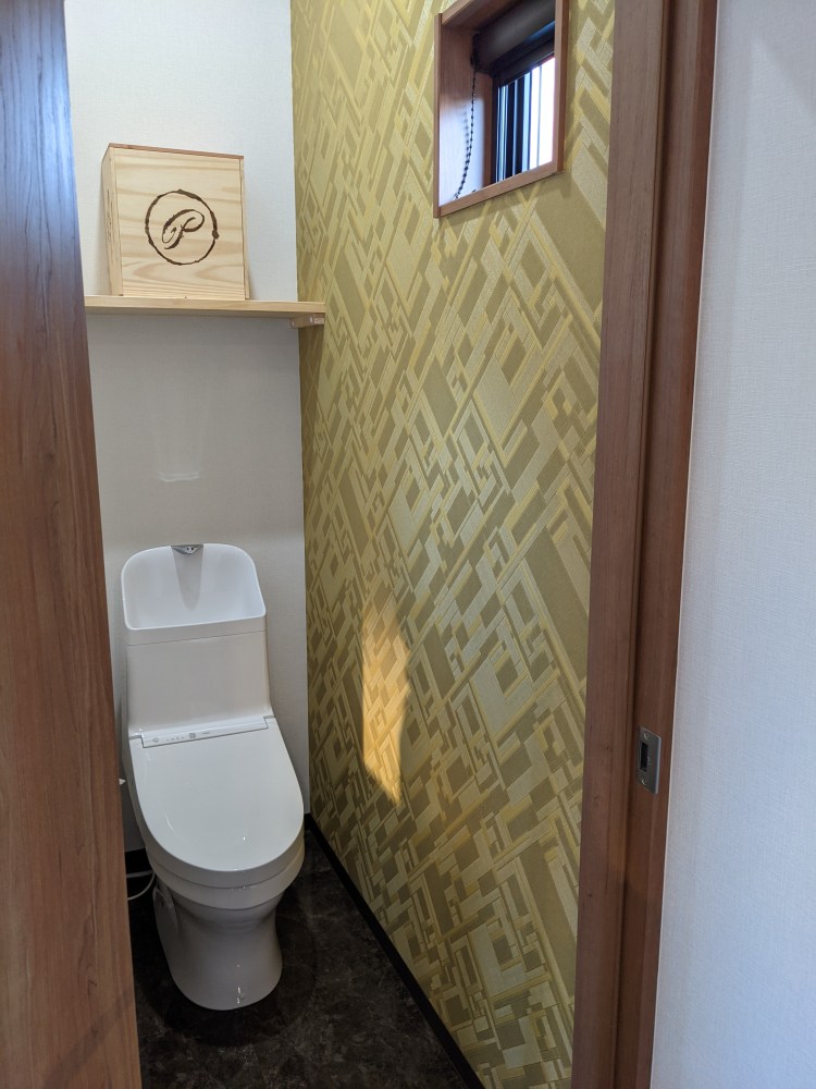 そして、トイレはオーナー様にお選びいただいたゴールドのアクセントクロスに、ブラウンのフロアタイル。限られた空間だからこそ、冒険していただきました☆