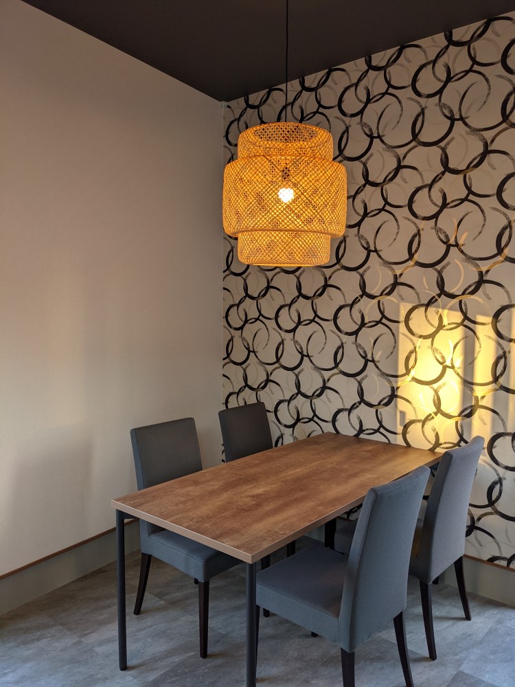 天井は黒で引き締め、床は暗くなり過ぎない様にグレーのフロアタイルを。そして、アクセントクロスは、オーナー様がデザインされたお店のロゴと同じ印象を受けた、筆で描いた様な柄のクロスにしました。光が当たると所々にゴールドが浮き出るのがとっても素敵で、一発OKいただきました☆こちらのクロスが入ったテーブル席だけ、少し異空間にしたかったので、チェアはグレーでまとめています。