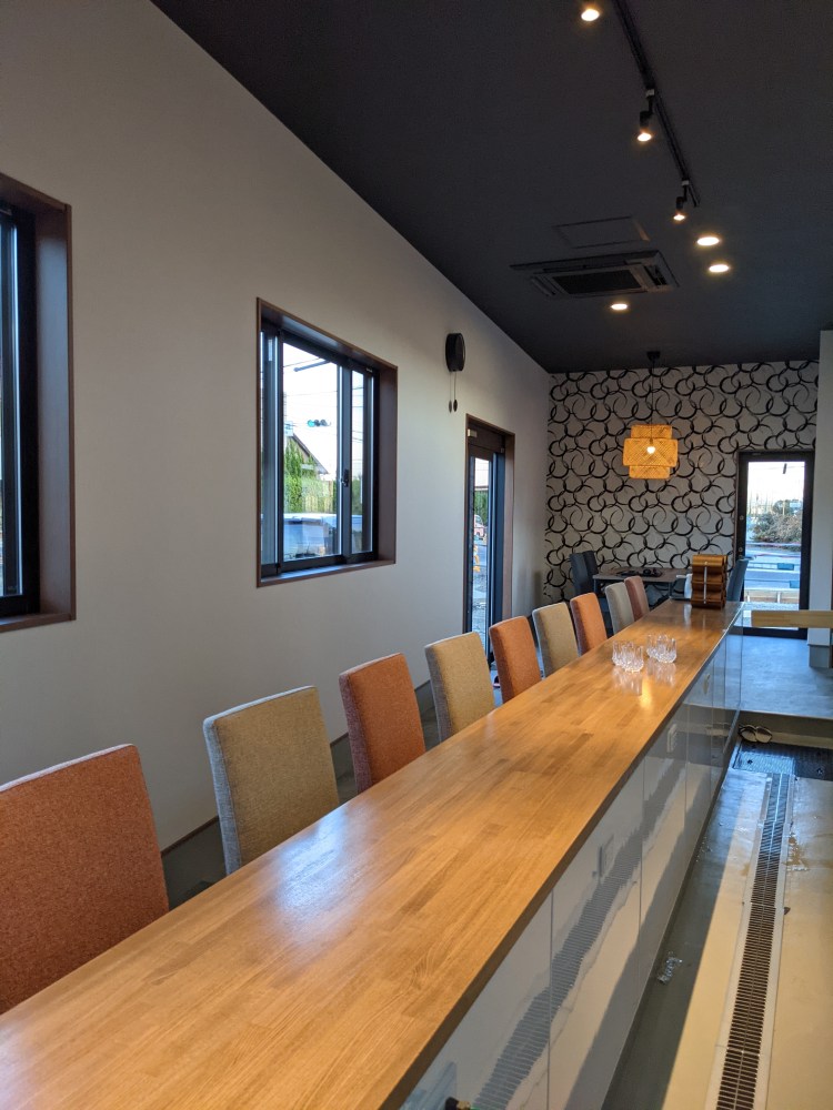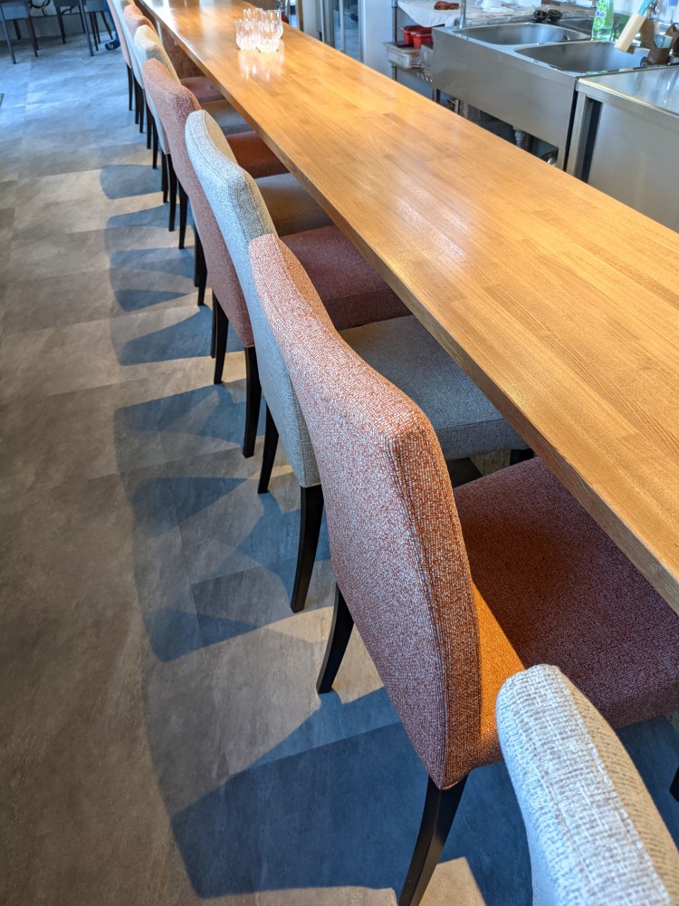 メインのカウンターに合わせたチェアは、優しいオレンジとベージュを交互に配置しました。時間を忘れて過ごせる空間になる様、落ち着いた雰囲気になったかと思います。